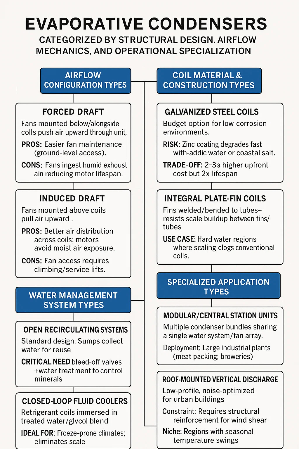 کندانسورهای تبخیری بر اساس طراحی سازه، مکانیک جریان هوا و تخصص عملیاتی طبقه بندی می شوند. در زیر یک تفکیک میدانی از انواع رایج ارائه شده است: